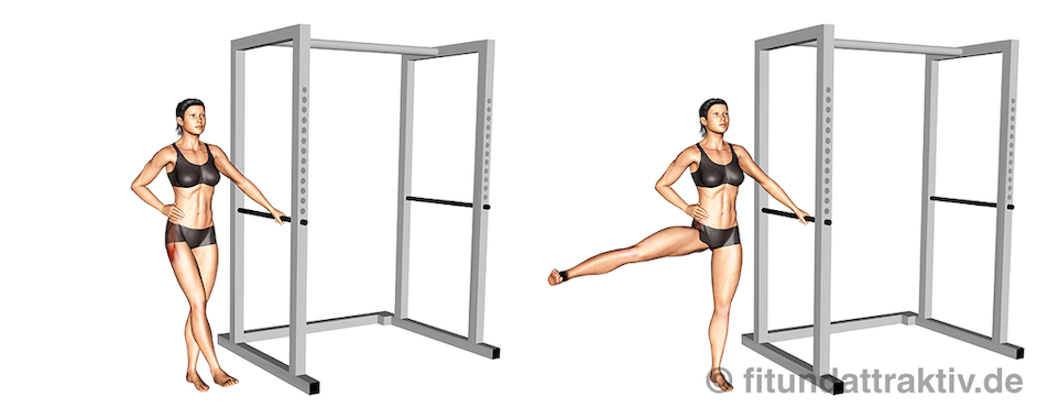 - Ausführung: Halte dein Standbein fest und strecke das andere Bein ganz gerade zur Seite aus. Hebe es langsam an, ohne dabei mit dem Körper zu wackeln oder Schwung zu holen. Du solltest das Ziehen nur an der Außenseite von Po und Oberschenkel spüren. Gehe so weit hoch wie möglich und lass das Bein dann langsam wieder sinken, aber ohne den Fuß ganz auf den Boden zu setzen. So bleiben deine Muskeln die ganze Zeit unter Spannung. Mache pro Bein 2 Durchgänge mit 8 bis 15 Wiederholungen.