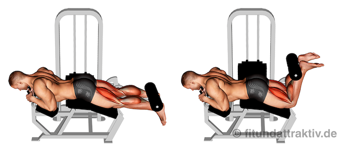 - Ausführung: Ohne jeglichen Schwung ziehst du deinen Unterschenkel hoch und nutzt so isoliert wie möglich den Beinbeuger. Wenn dein Unterschenkel senkrecht ist, lässt du ihn lansgam wieder nach unten. Strecke jedoch dein Bein nicht ganz aus, damit du die Spannung im Muskel aufrecht erhältst. Ebenso ist wichtig, dass das Gewicht von dem Gerät immer in der Luft bleibt. Für jedes Bein machst du jeweils 2-4 Sätze mit 8-12 langsam ausgeführten Wiederholungen.