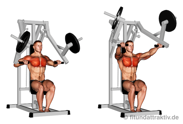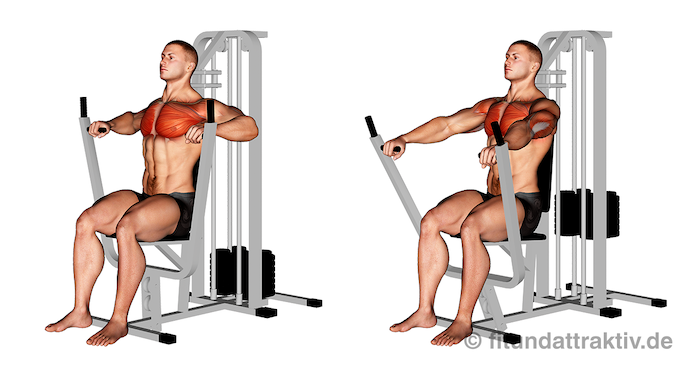 - Haltung: Der Oberkörper bleibt auch bei dieser Brustpresse Übung am Gerät, lediglich die Arme bewegen sich.