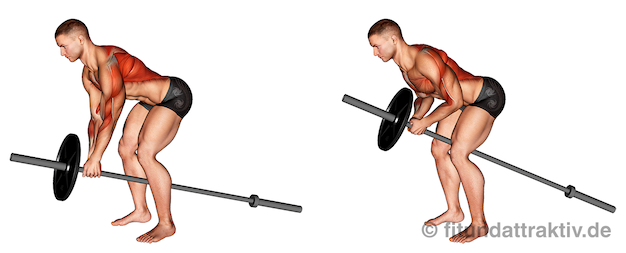 - Ausführung: Solltest du keine Langhantel zuhause haben, kannst du ebenfalls eine schwerere Kurzhantel mit beiden Händen umgreifen. Ziehe die Kurz- oder Langhantel ohne Schwung bis an deinen Körper nach oben und gehe nur langsam wieder in die Ausgangsposition zurück.