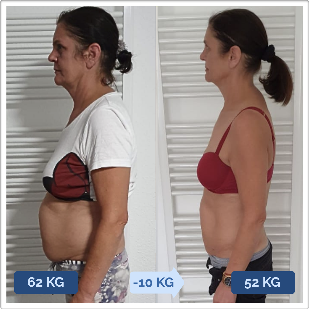 - Filomena über ihr Gewicht: „Filomena, 54 Jahre… gestartet mit 85,3 kg… aktuell bei 69 kg (mittlerweile hat Filomena 68,5 kg erreicht = -16,8 kg). Und sehr glücklich und sehr zuversichtlich. Und hätte nicht geglaubt, dass es funktioniert – auch bei mir.“ (Sie hat 22 cm Bauchumfang weniger).