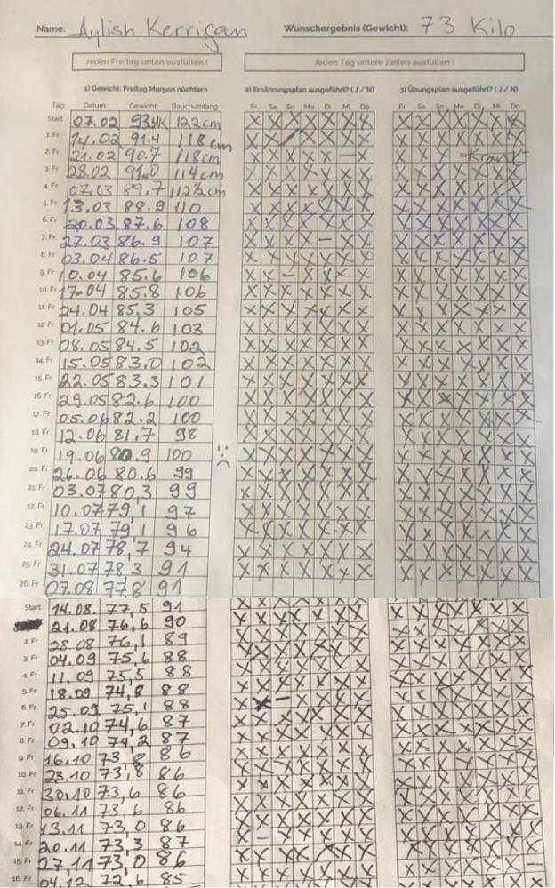 - Aylish über ihr Gewicht und Bauchumfang: "Ich habe geschrieben 93 kg - es war (aber) 94 oder 95 kg muss ich zugeben... Jetzt aktuell 78 kg." (= -16 kg) Tobias: "Und 31 cm Bauchumfang weniger?" Aylish: "Ja." Mittlerweile hat Aylish 72,6 kg (= -21 kg) und -37 cm Bauchumfang (siehe Aylish's neues Endergebnis-Blatt!)