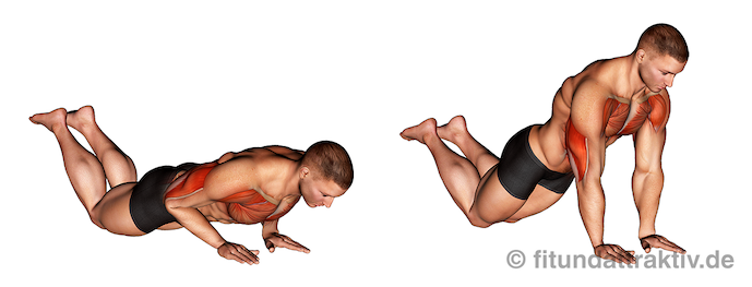 - Zielmuskeln: Der breite Griff macht den Liegestütz zum idealen Brustmuskeltraining ohne Geräte. Wir treffen an vorderster Stelle den Brustmuskel, der Trizeps und die vorderen Schultern unterstützen die Bewegung als sekundäre Helfer.
