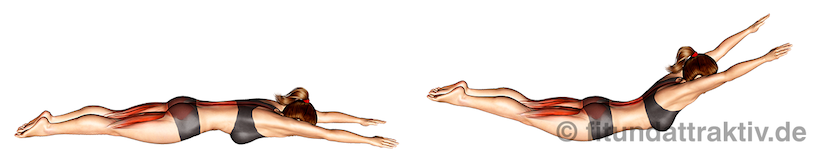 - Ausführung: Hebe den Oberkörper kontrolliert an, wobei die Kraft ausschließlich aus der Rückenmuskulatur kommen darf. Senke den Rumpf danach langsam wieder Richtung Boden, ohne ihn jedoch ganz abzulegen, um die Spannung aufrecht zu erhalten.
