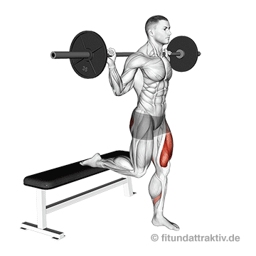 - Ausführung: Die Langhantel nimmst du anfangs von einem Hantelständer auf den oberen Rücken. Im Hohlkreuz leitest du die Bewegung nach unten ein, indem du mit deinem Po nach hinten gehst. Deine Knie dürfen zur Schonung beim runtergehen, nicht weiter vorne sein als deine Zehen. Sobald deine Oberschenkel waagerecht sind, drückst du dich ganz ohne Schwung wieder hoch. Nutze dafür vor allem deine Beinstrecker Muskeln.