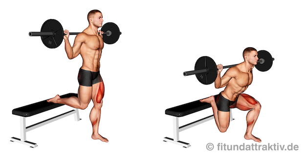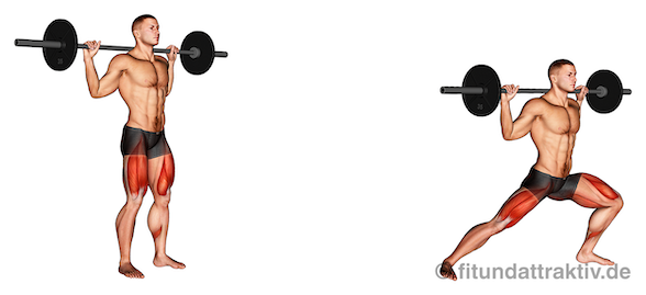 - Haltung: Bevor du die Langhantel aufnimmst, testest du die optimale Schrittweite aus. Sie muss so sein, dass dein Knie nie vor den Zehenspitzen ist.