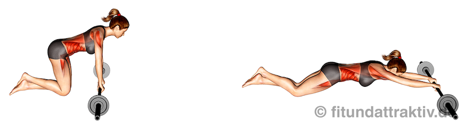 - Ausführung mit Langhantel (umständlich): Falls du deinen Bauch unbedingt mit einer Langhantel trainieren willst, kannst du die Übung Langhantel Ausrollen (englisch: Barbell Rollout) ausführen. Die Ausführung ist jedoch wesentlich umständlicher als die Kurzhantel Variante davor. Gehe mit deinen Knien auf eine Gymnastikmatte oder ähnliches und verschränke bei Bedarf die Füße. Die Verschlüsse der Langhantel lässt du weg, damit die Hantel locker rollen kann. Nutze als Unterlage für die Langhantel einen Boden, der nicht zerkratzt und trotzdem das flüssige Rollen unterstützt. Spüre bei der langsamen und kontrollierten Bewegung nach vorne und hinten, so gezielt wie möglich in die Bauchmuskeln rein. Wenn deine Kraft nachlässt, gehst du nicht mehr so weit vor.