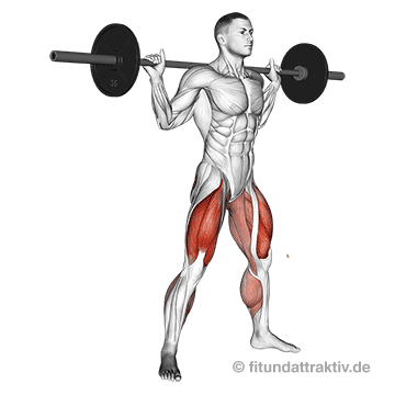 - Ausführung: Platziere das Gewicht im Nacken und gehe langsam in die Knie. Achte darauf, dass der Po zuerst nach hinten geht, bevor du tief gehst. Wenn du die waagerechte Position erreicht hast, drückst du dich kontrolliert und gleichmäßig wieder in den Stand.