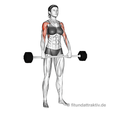 - Ausführung: Zieh die Hantel ganz ruhig gerade nach oben und konzentriere dich dabei voll auf deine Schultern. Wenn die Stange an deiner oberen Brust angekommen ist, lässt du sie ebenso langsam wieder runter.