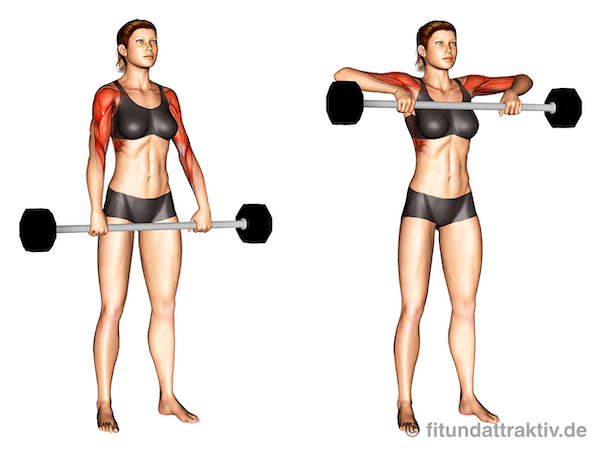 - Haltung: Deine Hände fassen die Stange etwas breiter als schulterweit an und dein Körper bleibt währenddessen in einer aufrechten Position.