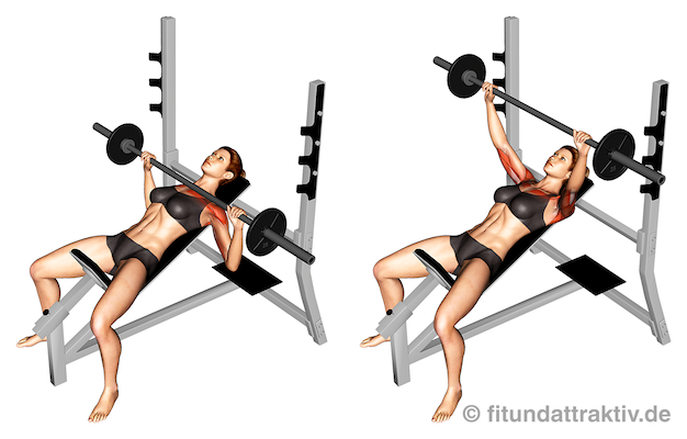 - Haltung: Wie erwähnt, ist eine flache oder nur ganz leicht erhöhte Bank ideal. Falls du die Lehne verstellen kannst, wähle lediglich die erste oder zweite Stufe. Deine Hände greifen die Stange deutlich weiter als schulterbreit, etwa zwei Handflächen pro Seite nach außen versetzt.