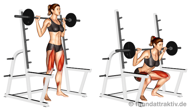 - Zielmuskeln: Hauptsächlich stärken wir mit der Langhantel-Kniebeuge die Beinstrecker vorne am Oberschenkel. Als zweites fordern wir die Muskeln am Po und als drittes die Rückseite deiner Oberschenkel an. Die Innen- und Außenseiten der Beine sowie die Waden und der untere Rücken werden nur nachrangig beansprucht.