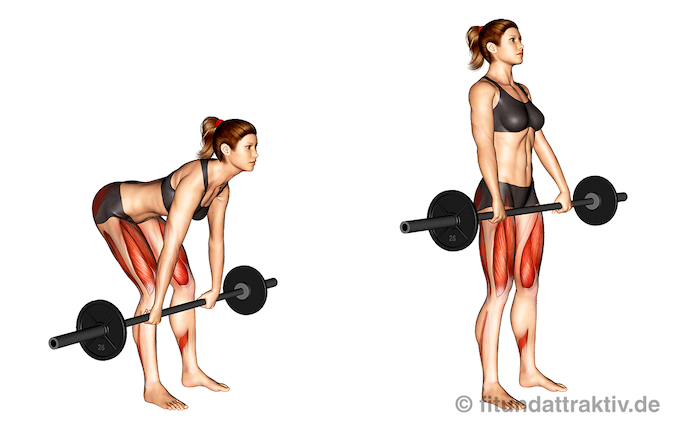 - Zielmuskeln: Das Kreuzheben mit der Langhantel ist vor allem dazu da, deinen unteren Rücken zu stärken. Je gerader du deine Beine dabei lässt, desto gezielter müssen die Muskeln im Rücken arbeiten. Dein Gesäß sowie die Vorder- und Rückseite der Oberschenkel helfen bei dieser Übung unterstützend mit.