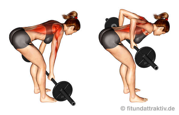 - Zielmuskeln: Langhantelrudern mit dem Griff von unten ist super für einen breiten Rücken. Auch der obere Rücken wird kräftiger, während die Oberarme helfend mitwirken. Die Schultern und die Bereiche um die Schulterblätter werden dabei nur wenig beansprucht.