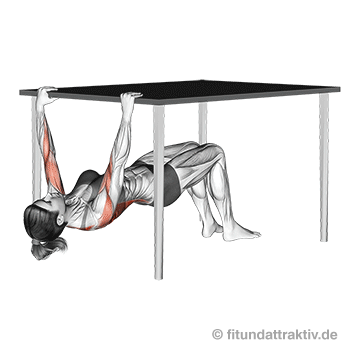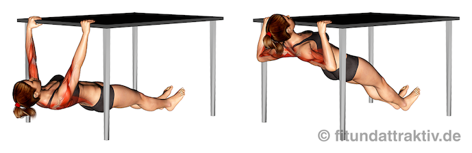 - Ausführung: Als Anfänger kannst du die Beine anwinkeln statt ausstrecken. Nutze so isoliert wie möglich die Kraft der oberen und seitlichen Rückenmuskeln, für das gesamte Training. Ohne jeglichen Schwung ziehst du deinen Körper nach oben, bis du fast mit der Brust den Tisch berührst. Dann gehst du langsam wieder herunter, streckst die Arme aber nicht ganz durch. Dadurch erhältst du die Spannung in deinen Muskeln die ganze Zeit aufrecht.