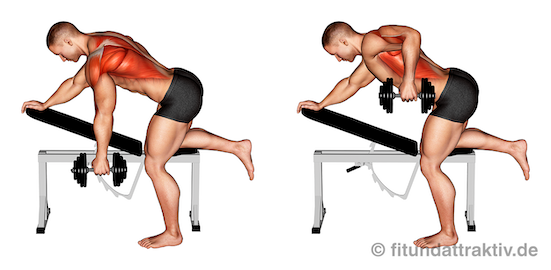 - Zielmuskeln: Beim einarmigen Kurzhantelrudern trainieren wir als erstes unseren Latissimus, sowie zweitrangig unseren Trapezmuskel. Unterstützend wirken zum einen der Bizeps am vorderen Oberarm und der sogenannte Brachialis am seitlichen Oberarm. Ebenfalls nachrangig beanspruchen wir die Muskeln an den hinteren Schultern, sowie nahe unserer Schulterblätter.