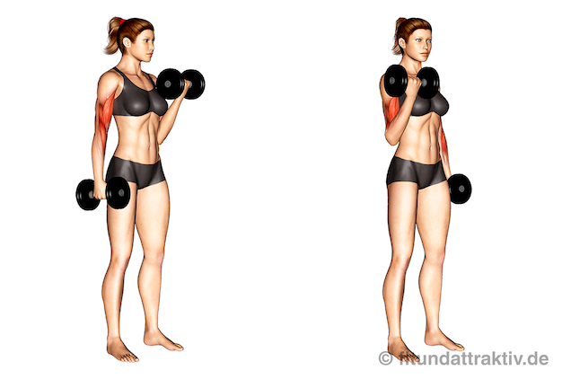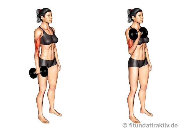 - Zielmuskeln: Auch hier stärken wir vorrangig den Bizeps. Bemühe dich, so wenig Kraft wie möglich aus dem Handgelenk oder Unterarm zu ziehen. Du kannst den Ablauf anfangs mit einer Wasserflasche üben. Sobald du stärker wirst, ist eine Hantel für noch weniger schlaffe Haut an Armen die beste Wahl.