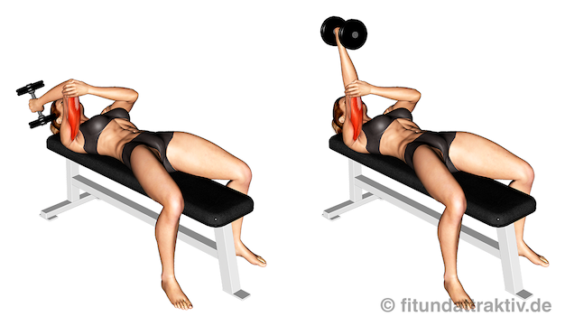 - Ausführung mit Hantelbank: Lege dich flach auf die Bank und stelle die Füße stabil auf. Stütze den Arm senkrecht ab und führe das Gewicht präzise aus der Muskelkraft deines Oberarms. Falls du müde wirst, gehe nicht mehr ganz so tief, sondern hänge noch ein paar kurze Bewegungen in der oberen Hälfte dran.