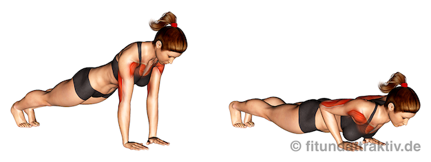 - Zielmuskeln: Ganz genau wie bei der Übung davor fordern wir in erster Linie den Trizeps bzw. die Schwabbelarme, Hanteln benutzen wir auch hier nicht. Die Brustmuskeln stärken wir an zweiter Stelle und die vordere Schulter an dritter Stelle. Schwabbelarme Hanteln