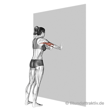 - Ausführung: Beuge dich jetzt mit dem Oberkörper so weit vor, bis deine Nase fast die Wand berührt. Drücke dich dann ganz ruhig und ohne Schwungkraft wieder hoch. Hole die Kraft dabei nur aus der Rückseite deiner Oberarme. Wichtig: Du streckst die Arme oben nicht ganz durch, damit die Spannung im Muskel bleibt.