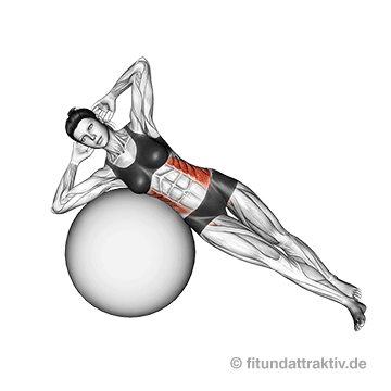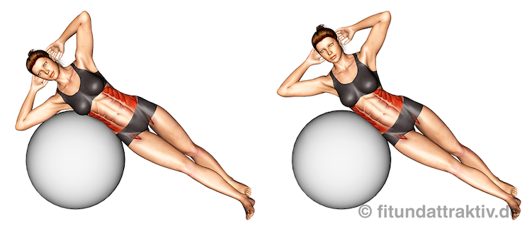 - Dazu legst Du Dich seitlich mit der Hüfte auf den Pezziball und die Beine sind gerade und stabil. Die Füße müssen festen Halt am Boden finden, damit Du ohne umzufallen seitliche Crunches ausführen kannst. Verschränke dabei die Hände hinter dem Kopf. Durch den zusätzlichen Balanceakt wird mit dieser Übung für die seitliche Bauchmuskulatur der Schwierigkeitsgrad erhöht.