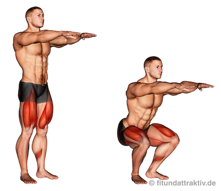 - Ausführung: Die Arme lässt du locker senkrecht nach unten und holst auch kein Schwung beim nach oben gehen. Gehe langsam in die Hocke bis die Oberschenkel die Waagerechte erreicht haben. Anschließend bewegst du dich aus der Kraft deiner Beinmuskeln, wieder langsam hoch.