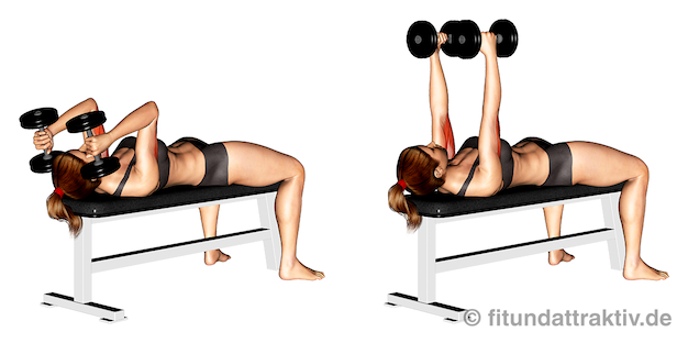 - Ausführung: Drücke die Gewichte ohne Ruck nach oben und aktiviere dabei gezielt die hintere Arm-Muskulatur. Strecke die Arme oben beinahe ganz durch und senke sie dann langsam ab. Sollte die Kraft am Ende abrupt weniger werden, verringere bei den letzten Zügen einfach den Bewegungradius und mache ein paar letzte Wiederholungen in der oberen Bewegungshälfte.