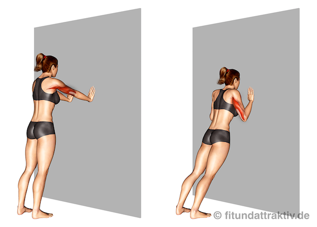 - Haltung: Stütze deine Hände schulterbreit an der Wand ab und achte darauf, dass die Ellenbogen nah am Körper bleiben. Je weiter du mit den Füßen von der Wand wegtrittst, desto intensiver wird die Belastung.