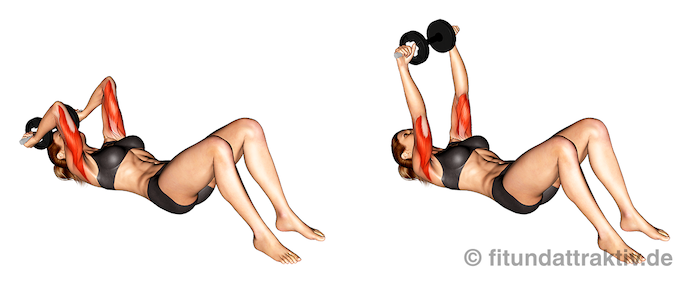 - Ausführung: Senke das Gewicht langsam neben deinem Kopf ab und drücke es danach ohne Ruck wieder nach oben. Konzentriere dich dabei voll auf das Gefühl im Muskel. Mache pro Arm etwa 10 bis 15 Wiederholungen bei 2-3 Sätzen und erhöhe das Gewicht, wenn es zu leicht wird.