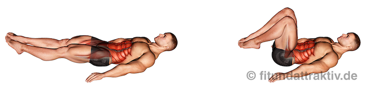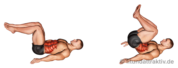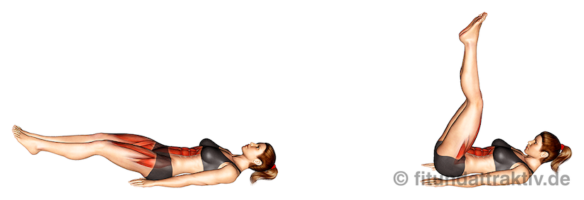 - Zielmuskeln: Diese liegende Bauch-Übung beansprucht die unteren Segmente und den oberen Bauch. Der große Gesäßmuskel wird hierbei nur minimal mittrainiert.