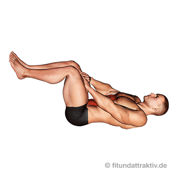 - Tipp: Durch eine stärkere Neigung der Knie zum Oberkörper verschiebt sich der Fokus weiter nach oben – sprich die Übung geht dann mehr auf die oberen Bauchmuskeln. Du bestimmst die Intensität der Übung im Grunde genommen selbst. Je mehr du von oben mit den Armen gegen deine Oberschenkel drückst, desto schwieriger wird die Übung.